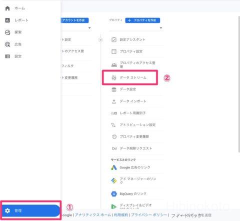1.左下の管理をクリックして、プロパティからデータストリームをクリック